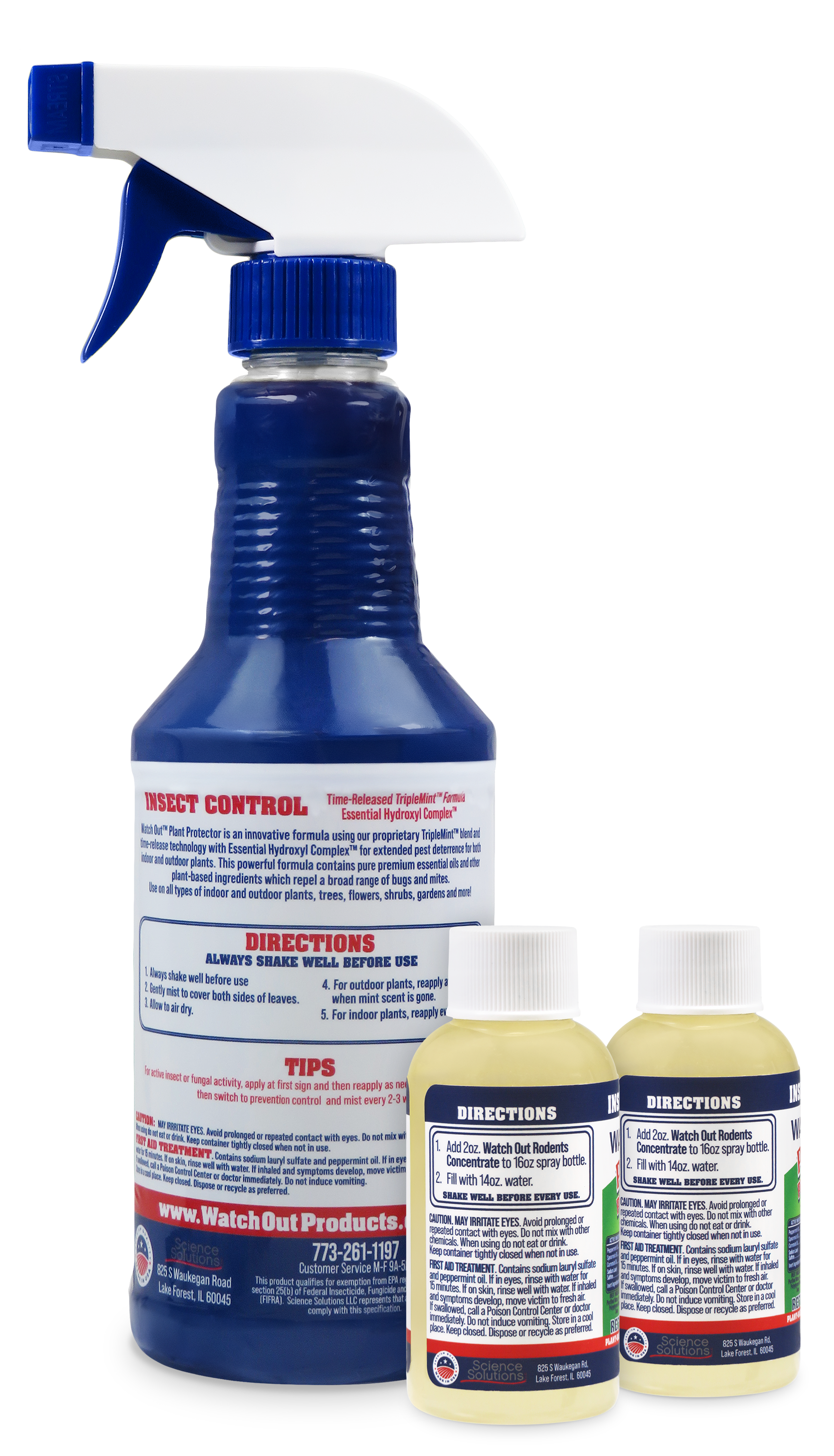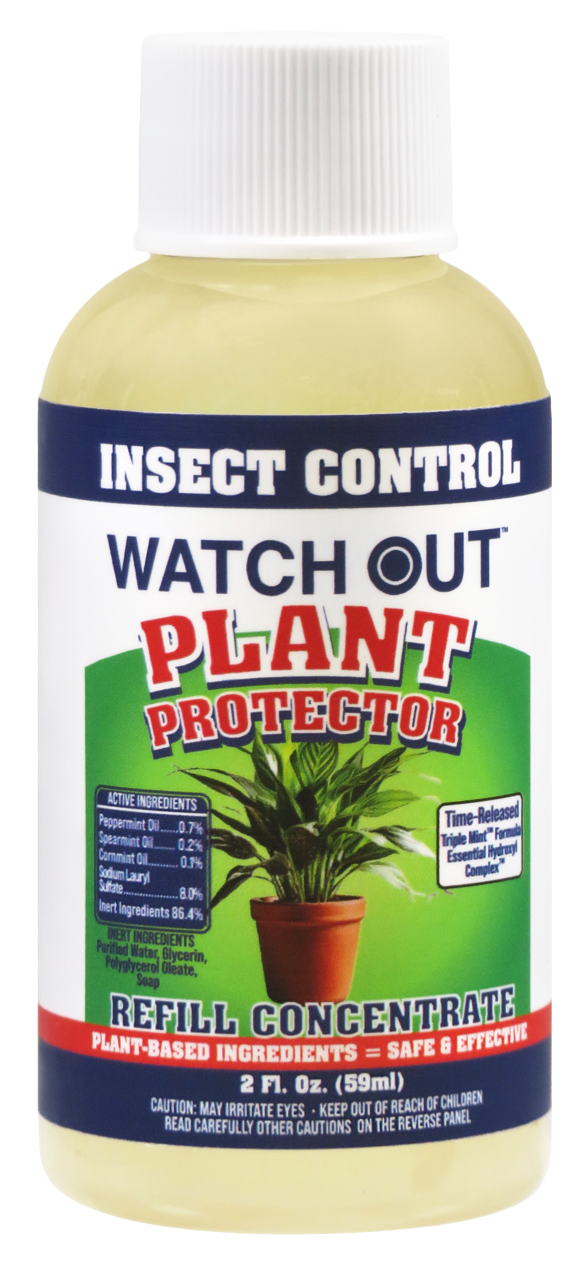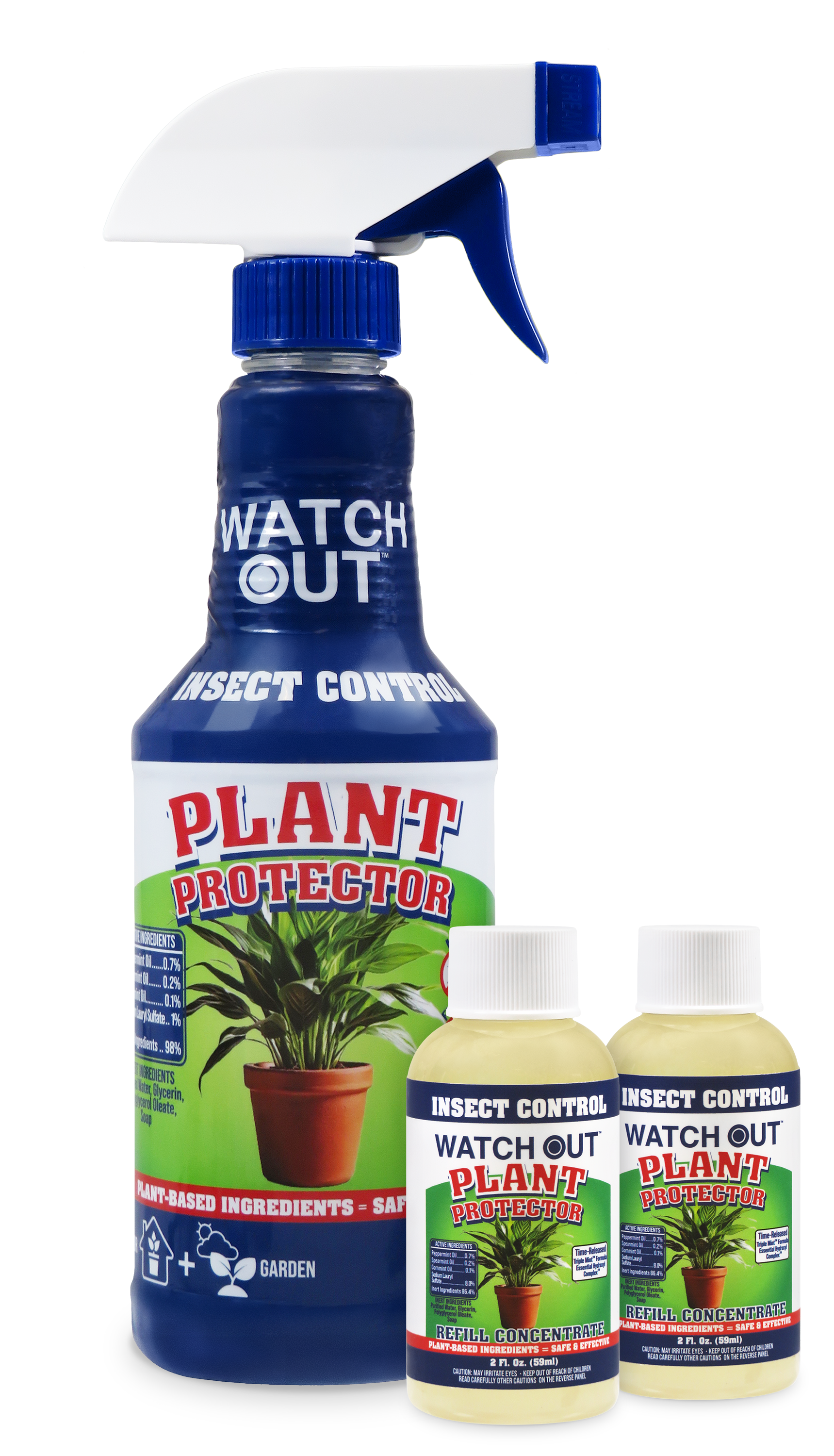 Watch Out Plant Protector Concentrate Kit uses TripleMint™ essential oil technology to help safeguard indoor and outdoor plants from common insects. Our plant-based formula combines a proprietary essential oil blend with a time-release system designed to create a strong scent barrier around leaves, stems, and soil. Each kit includes one reusable 16 fl oz spray bottle and two 2 fl oz concentrates for easy mixing and continued use in homes, gardens, patios, and greenhouse areas.